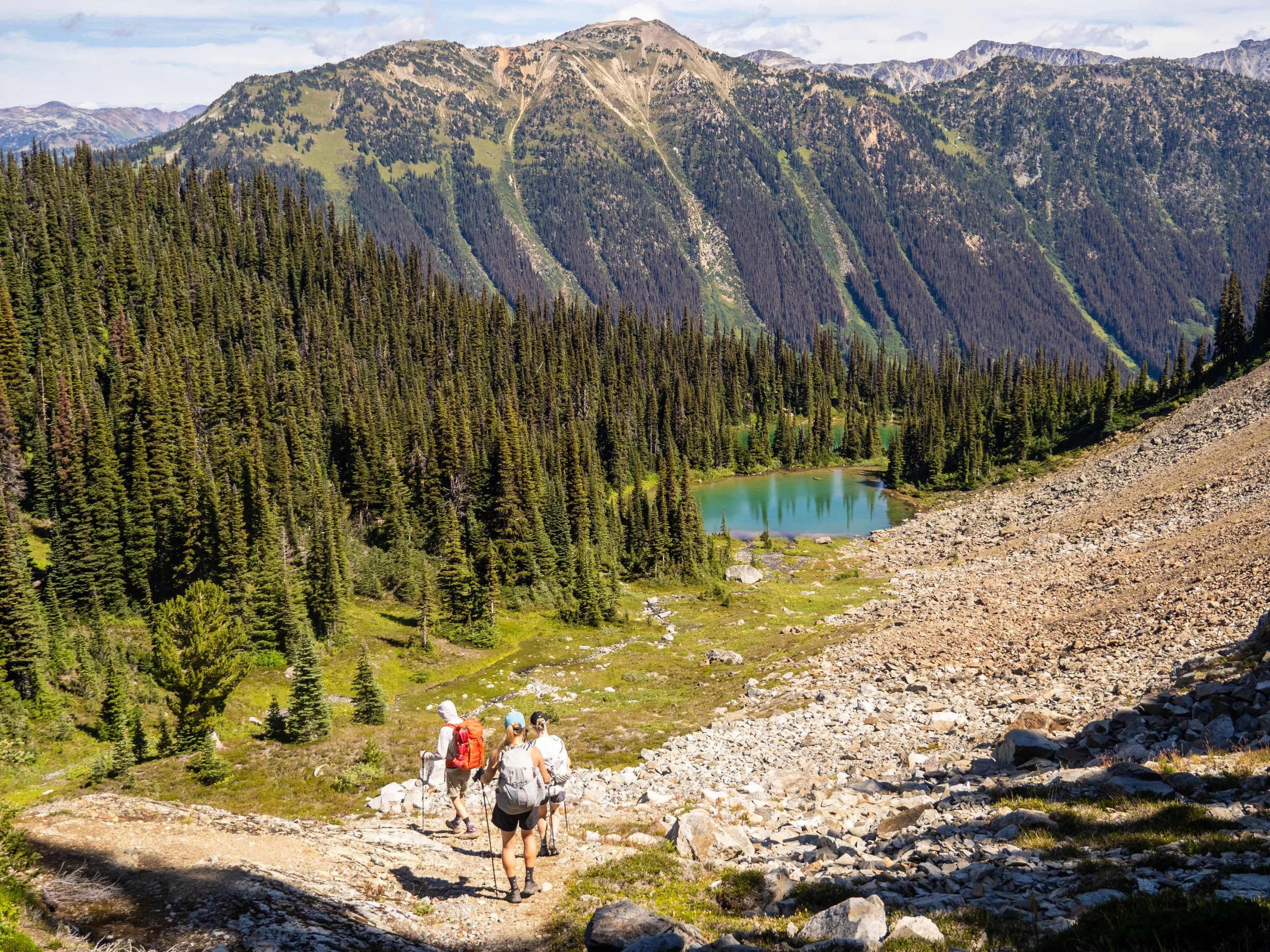 The trail picks up again down in the valley, where the descent from Ronayne is fairly direct and uncomplicated. From there, the route winds past even more lakes, open meadows, and flowing streams, weaving together an incredible lush landscape.