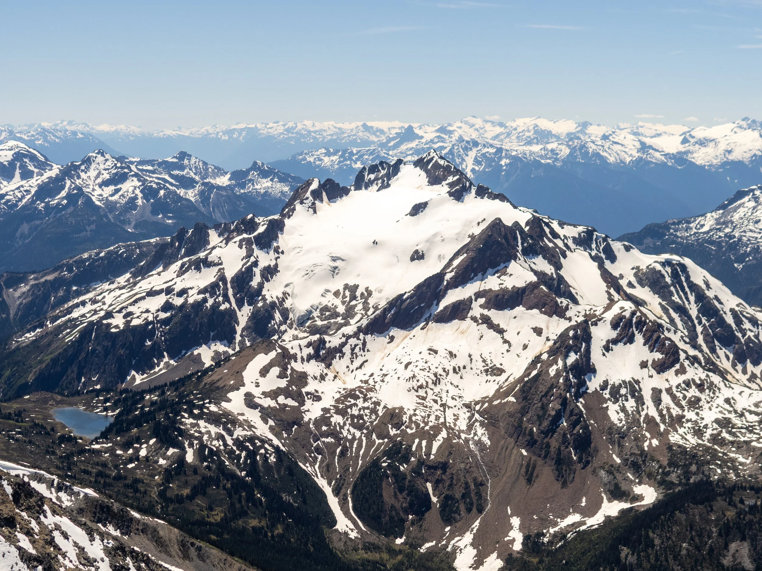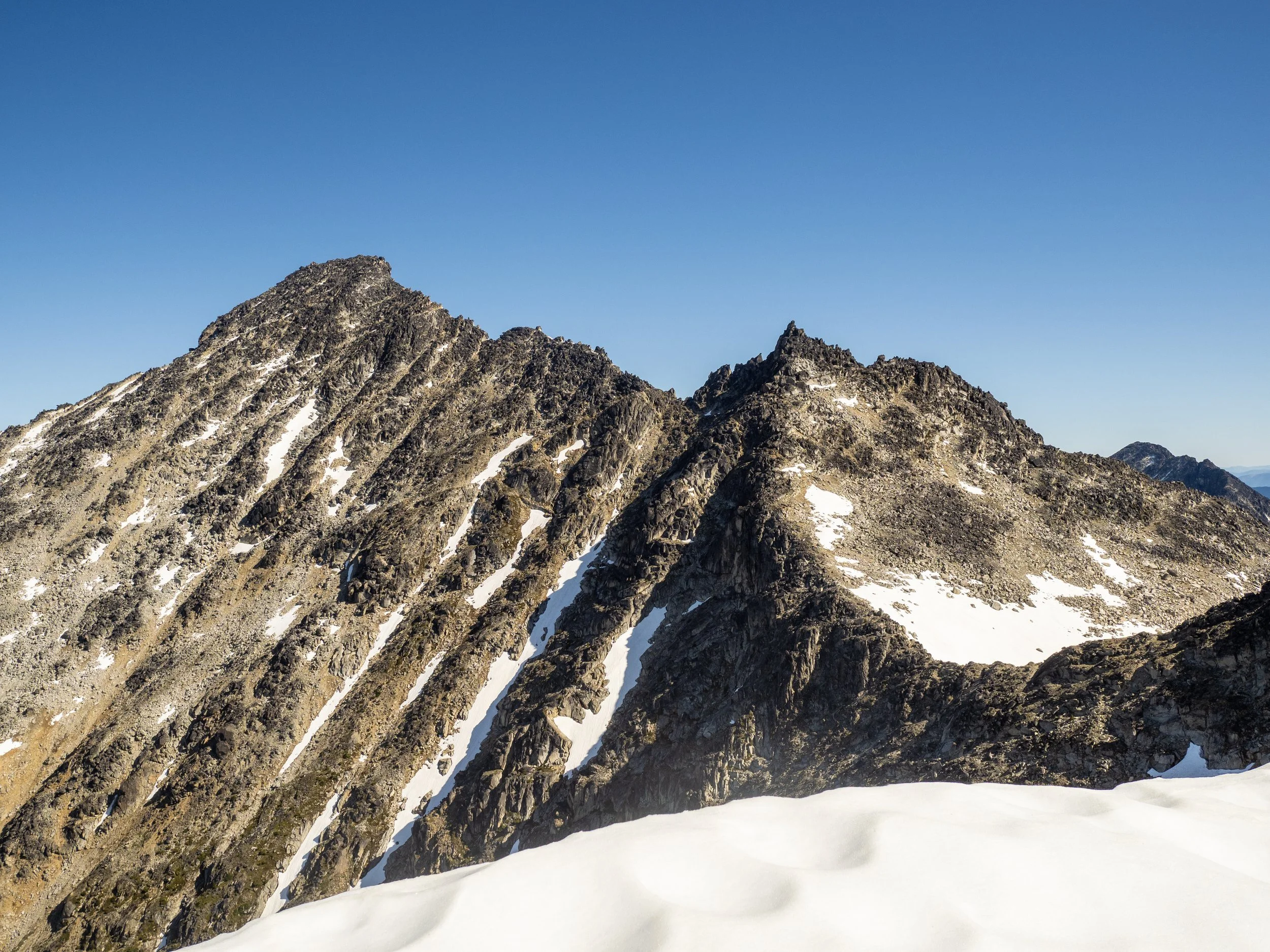 View of the route back from Tricouni. Cypress is the smaller triangle on the ridge on the left, the two teeth of Fee near the middle, and the far ridge dropping to the right is Brandywine.